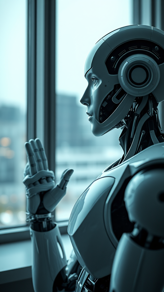 A robot gazing out a window, with a close-up of another seated android showcasing a human-like face, highlighting its intricate design. The scene captures the essence of a futuristic robot portrait, representing strong artificial intelligence and the looming AI singularity. The detailed humanoid android serves as a testament to advanced technology, merging human features with machine precision in a striking portrait of a humanoid robot embracing the future of artificial intelligence.