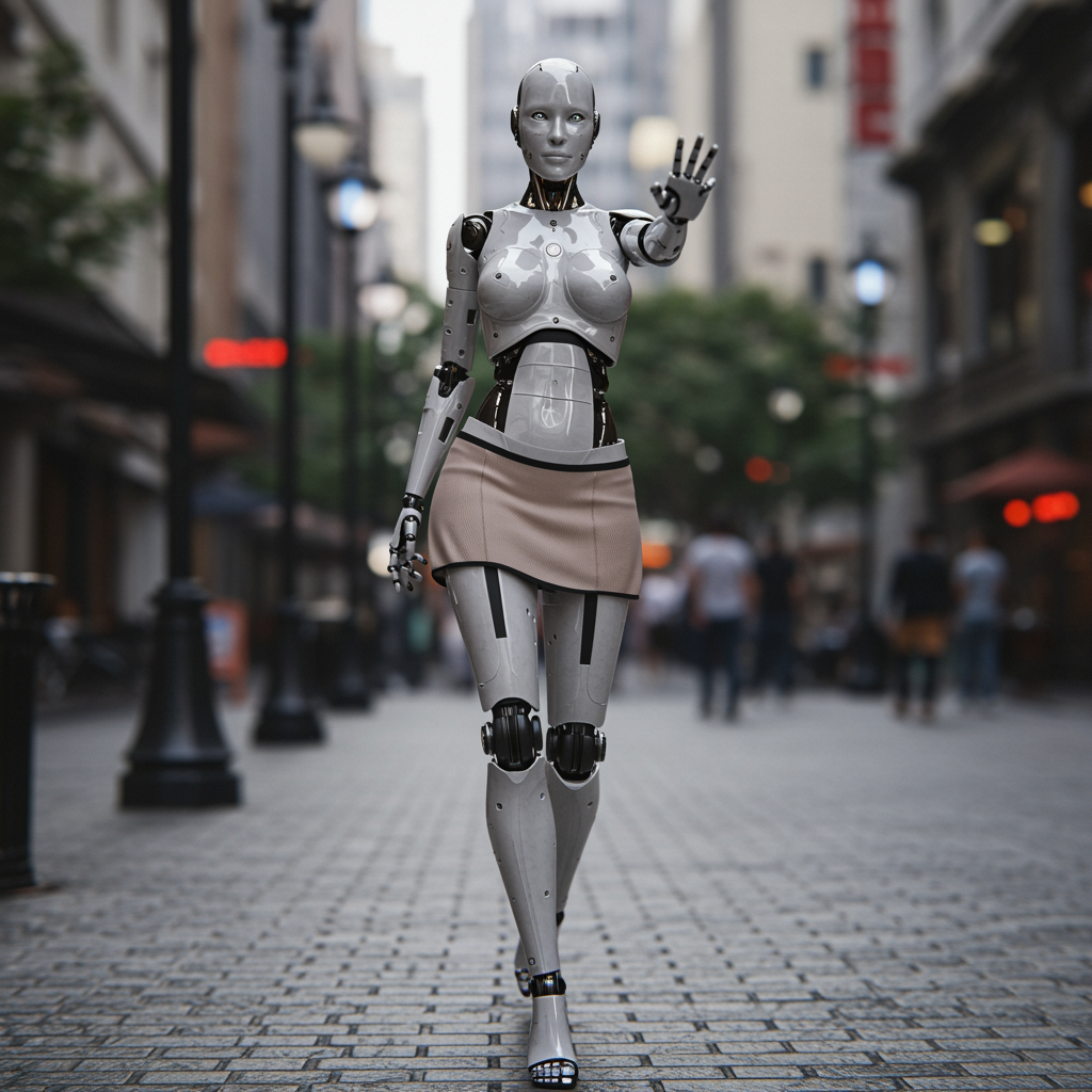 A robotic figure with a shiny silver metal body and a hint of human-like features is confidently strolling down a bustling city street. This android exudes a blend of futuristic elegance and mystery, wearing a stylish mini skirt that adds a touch of modern fashion. The urbanscape serves as a dynamic backdrop, enhancing the contrast of its faceless visage and smooth metallic skin. It stops to acknowledge the viewer, its form captured in a striking full-length portrait that showcases detailed skin textures and a hyper-realistic finish. The scene, framed with cinematic soft lighting and a shallow depth of field, highlights every nuance in sharp focus, bringing the android to life in vivid clarity. Subtle visual modifications and artistic nuances imbue the photograph with an 8k, high-quality aesthetic, ensuring a captivating blend of realism and sci-fi imagination.