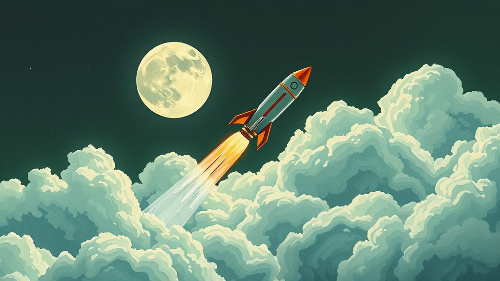 A rocket soaring through clouds into space, moon in view, inspired by Laurie Greasley and James Gilleard, Genshin Impact influences, popular on Pixiv Fanbox, using an acrylic palette knife technique, minimalistic with limited green hues, simplistic background, trending on ArtStation, low detail emphasis, 8k resolution, UHD, HDR. Featuring an abstract, fluid form, avoiding realism, subtle deviations in structure, harmonious composition without distractions.