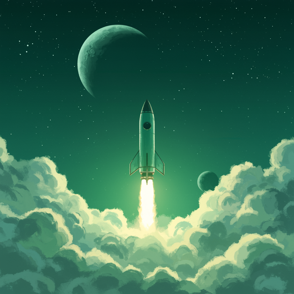 A rocket soaring through clouds into space, with the moon in the backdrop, inspired by the styles of Laurie Greasley, James Gilleard, and the aesthetic of Genshin Impact, capturing the essence of trending Pixiv Fanbox art. Painted with an acrylic palette knife in a minimalistic style, the artwork features a limited color palette with an emphasis on green, set against a simple background reminiscent of DeviantArt, trending on ArtStation. The scene is rendered in low detail, boasting 8K UHD HDR quality, avoiding disfigured or distorted elements, while being free of any logos, text, or watermarks, ensuring a clean and seamless visual experience.