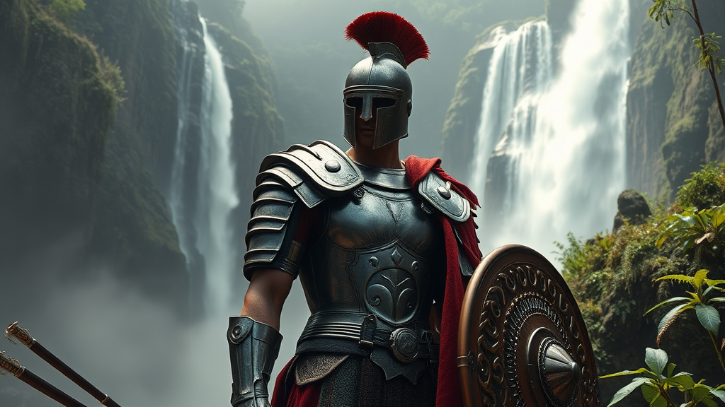 A Roman knight wearing intricate Spartan armor stands amidst the lush Amazon River Gorge. He is positioned close to a magnificent waterfall, the mist from the cascade enveloping him slightly. The scene is captured with 8k ultra-realistic detail, utilizing advanced photorealistic photography lighting. The armor glistens with refined reflection mapping, showcasing every ultra-detailed facet of the metalwork. The cinematic quality of the shot is enhanced through meticulous VFX post-production and cutting-edge RTX ray tracing lighting, creating a compelling, lifelike ambiance that hints at an epic narrative.