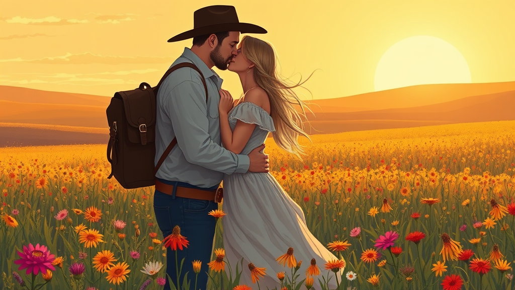 A romance illustration featuring a couple wrapped in a passionate embrace, sharing a tender kiss in the heart of the Wild West. They stand amidst a lush, vibrant field of wildflowers swaying gently in the breeze, under the expansive open sky. Both wear attire typical of the western frontier, adding authenticity to their timeless love story. The scene captures the essence of romance and adventure, as the golden rays of the setting sun paint the landscape in warm hues, evoking a sense of endless possibilities.