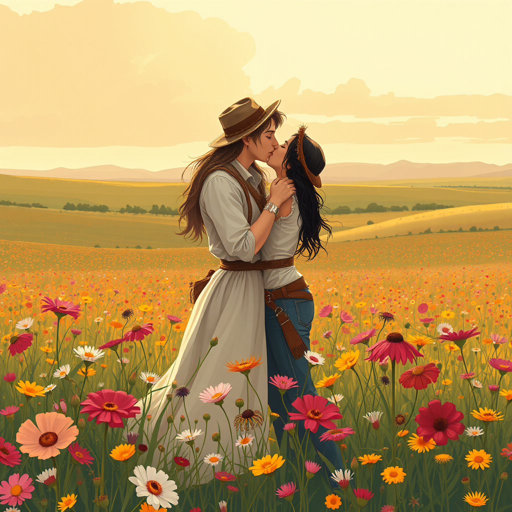 A romantic illustration capturing a couple locked in a passionate kiss, reminiscent of a timeless romance novel, set in the Wild West. They stand amidst a vibrant, blooming field of wildflowers, with a gentle breeze rustling the petals, evoking a sense of untamed passion and frontier allure against the vast, open landscape.