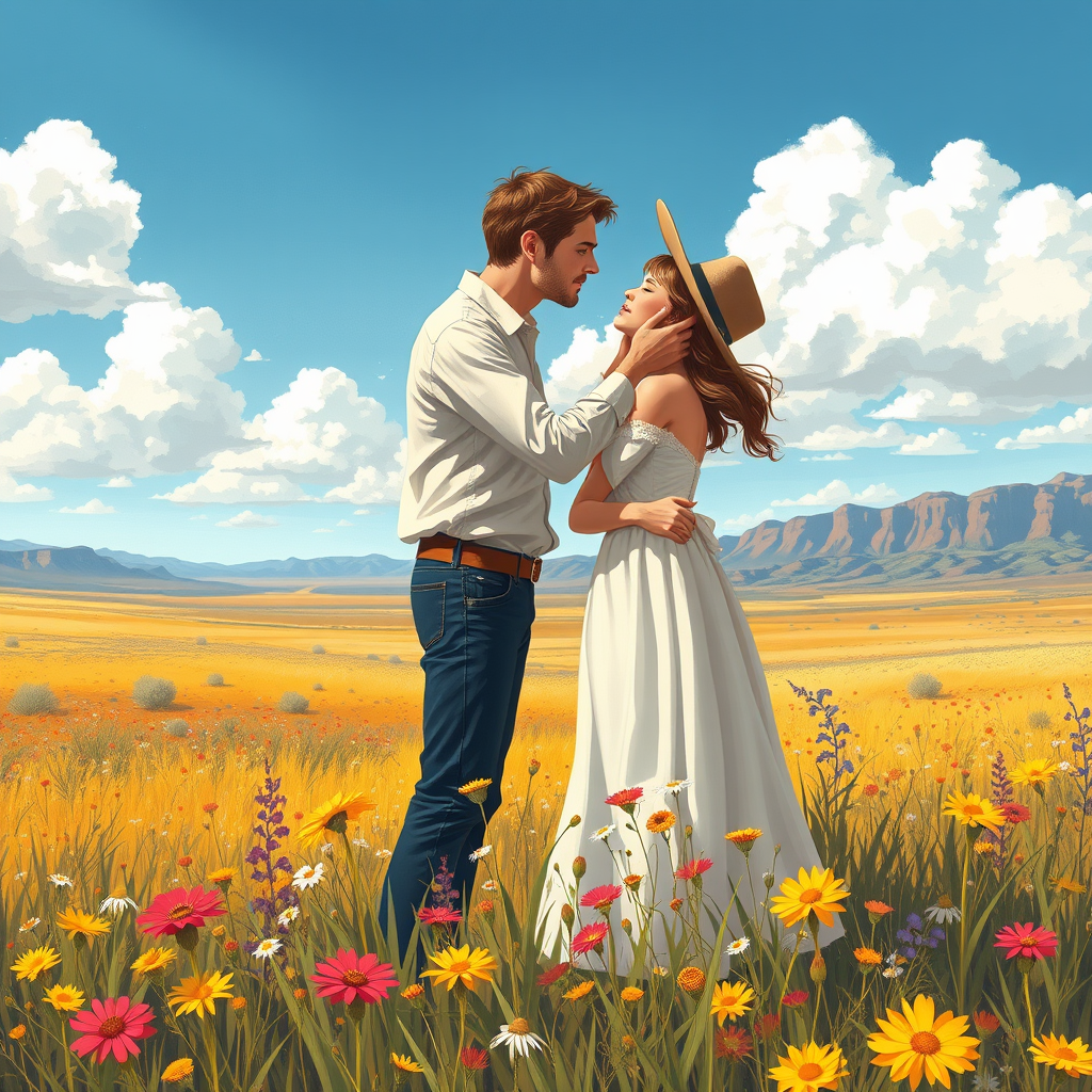 A romantic illustration capturing a couple locked in a passionate kiss, embodying the essence of a romance novel set in the Wild West. They stand embraced within a vibrant field of wildflowers swaying in the soft, whispering breeze, with the vast, rugged landscape stretching in the background, under an expansive blue sky filled with fluffy white clouds.