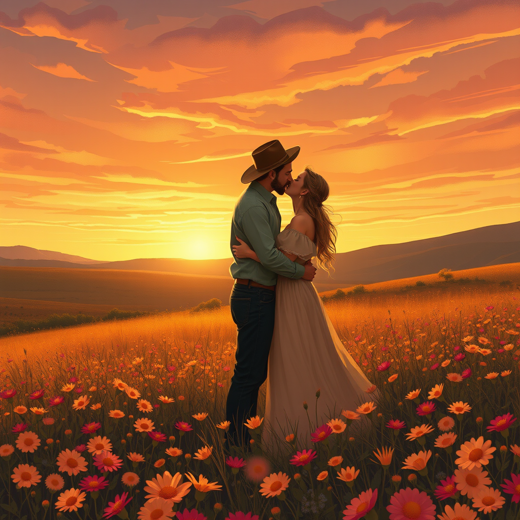 A romantic illustration depicts a couple locked in a passionate kiss amidst the rustic charm of the Wild West. They stand enveloped in a vibrant field of blooming wildflowers, their forms gently brushing against the petals as a soft, tender breeze caresses the scene. The expansive sky above is tinged with the warm hues of an early sunset, casting a golden glow over the lovers and the untouched beauty of the landscape, embodying the timeless allure of love in its rawest form.