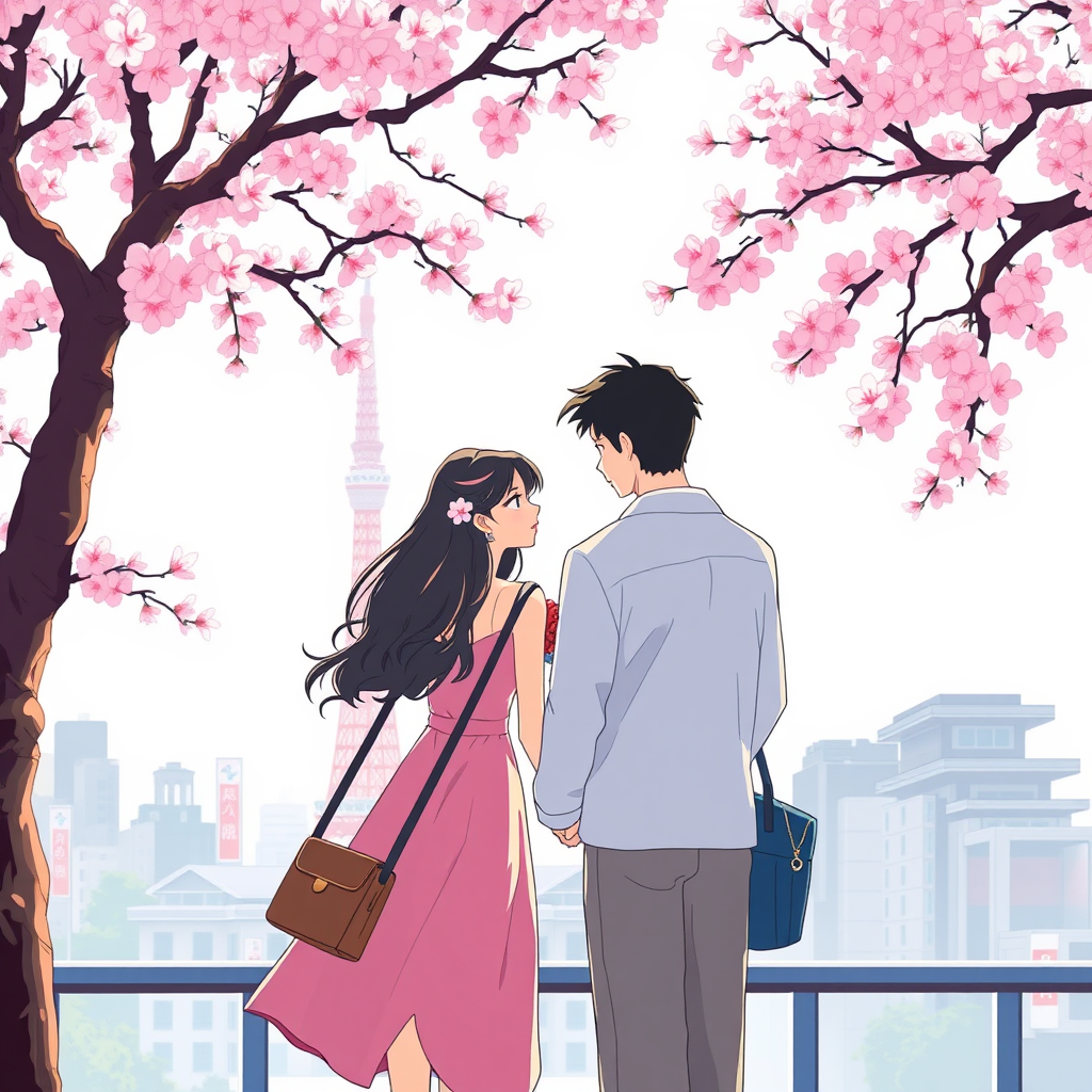 A romantic summer adventure in Tokyo unfolds for a couple deeply enamored with sakura blossoms, inspiring a t-shirt design that captures their sweet journey. The artwork blends pixel art details with a Studio Ghibli style, offering a harmonious balance of space and color. Set against a pristine white background, the scene comes to life in ultra-high quality, rendering the essence of Tokyo's vibrant summer and the timeless beauty of cherry blossoms into a captivating visual narrative.
