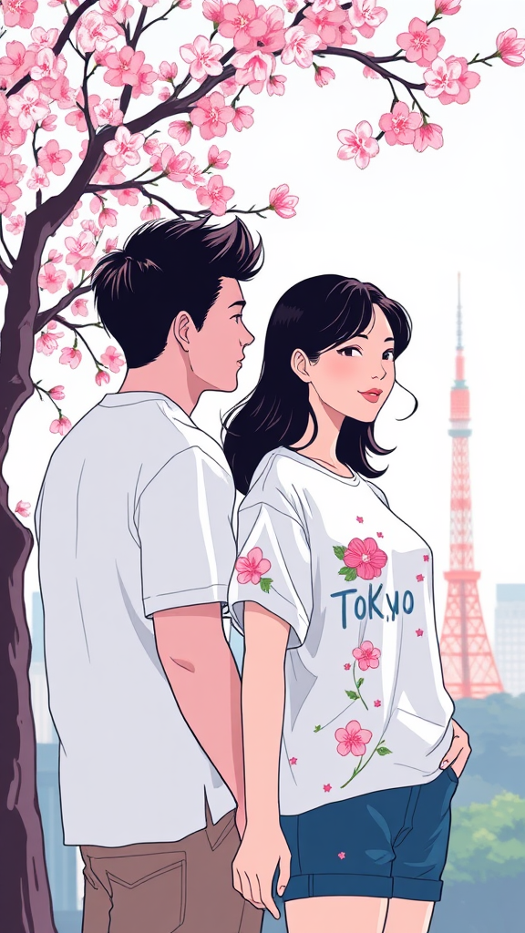 A romantic summer escape to Tokyo unfolds for a couple enchanted by sakura blossoms; their t-shirts capture the essence of balance and harmony, featuring intricate pixel art in a Studio Ghibli-inspired design against a clean, white backdrop, conveying an ultra high-quality aesthetic.