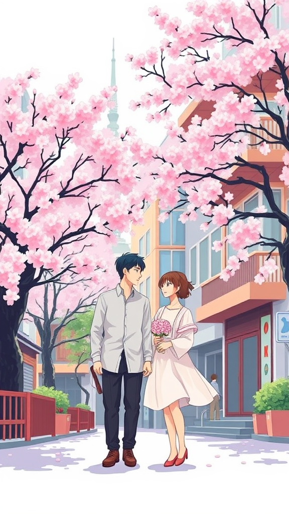 A romantic summer journey in Tokyo capturing the essence of sakura blossoms with a sweetheart couple set in a pixel art style reminiscent of Studio Ghibli, highlighting balance and harmony in the composition against a crisp white background, designed for a high-quality t-shirt.