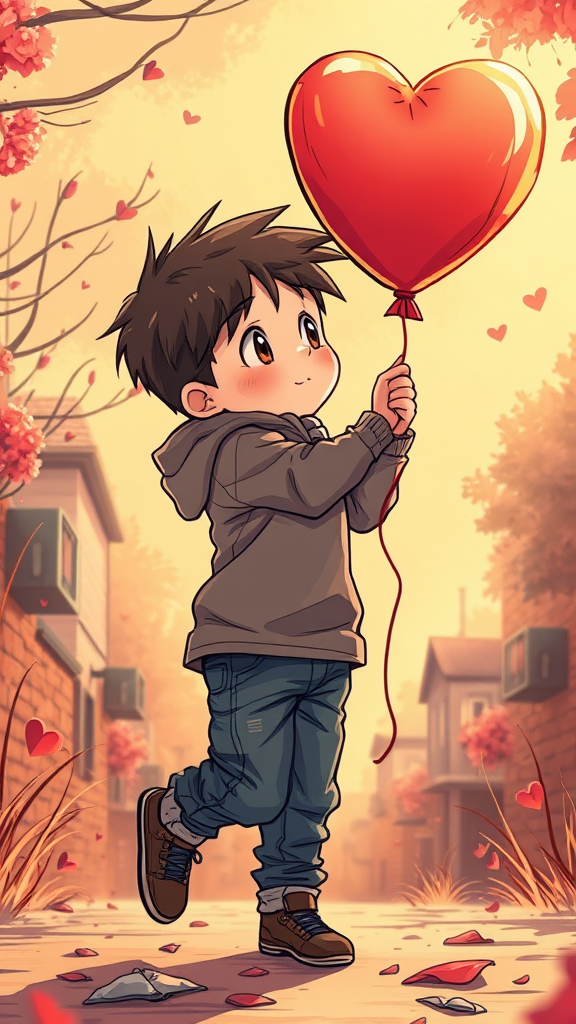 A romanticized illustration of a young boy in a dynamic pose, clutching a heart-shaped balloon, rendered in the expressive style of a comic panel with influences from Sketchfab and Poodlepunk. The artwork uses warm tones and HDR effects to highlight the scene's emotional depth, capturing a moment reminiscent of Romantic Academia. The scene is depicted in sharp focus and high resolution, giving it a 32k quality akin to #screenshotsaturday art. The composition offers a blend of creativity, with slightly exaggerated figures that evoke a sense of whimsy and tenderness amidst a beautifully detailed backdrop.