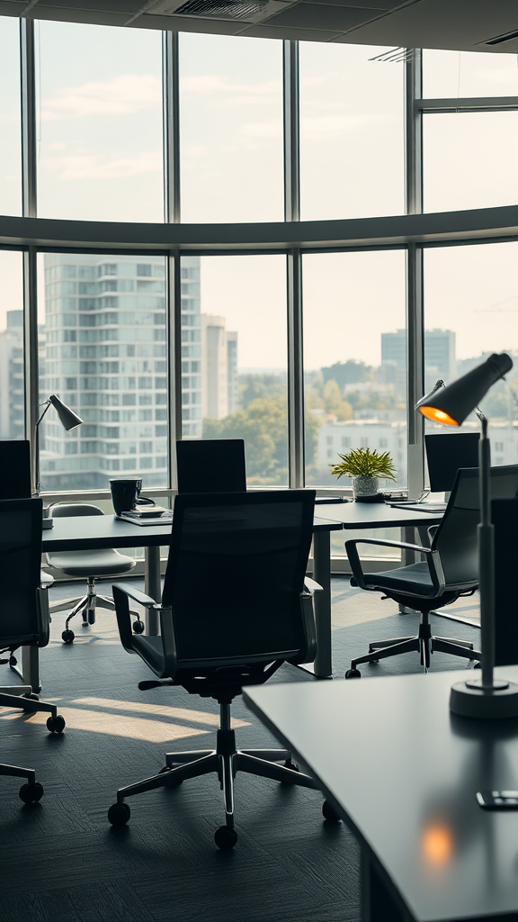A roomy workspace featuring a panoramic window view, furnished with ergonomic Herman Miller Aeron chairs and sleek Artemide Tolomeo desk lamps; captured using a Canon EOS R5 camera with a 50mm f/1.2 lens, skillfully combining natural daylight with subtle LED illumination for a harmonious ambiance.