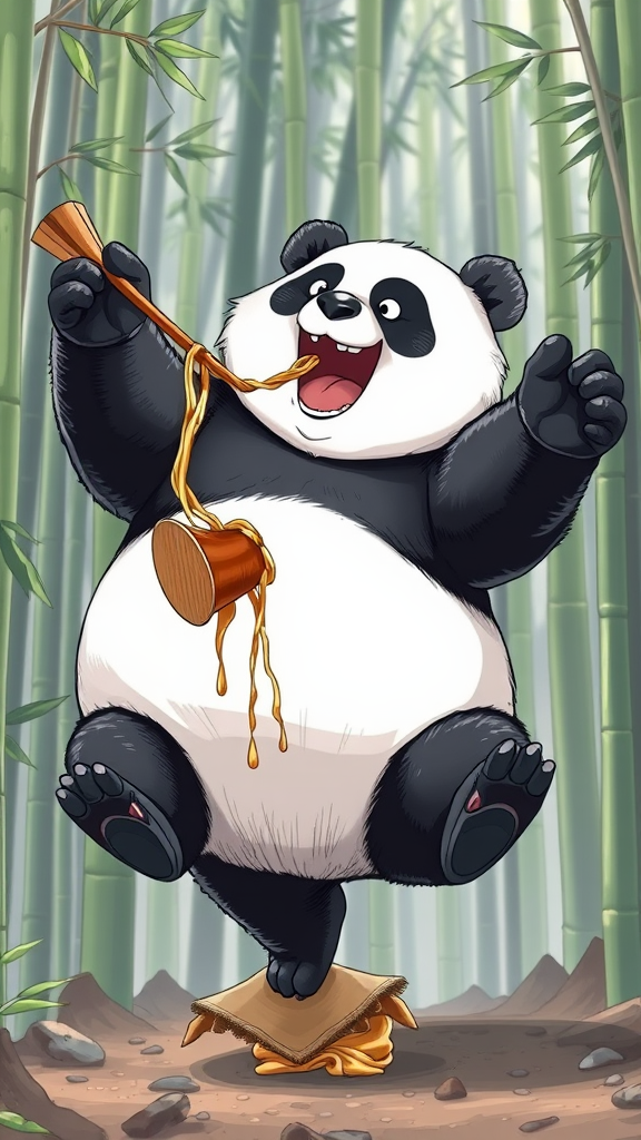A rotund panda balancing skillfully on one leg, slurping up noodles with blissful enthusiasm, drawn in the intricate and dynamic style of Takeshi Obata for Shueisha, featuring rich anime detailing and vibrant 8k resolution. The panda's fur is meticulously textured, with highlights accentuating its playful expression, set against a backdrop of bamboo forests with soft, diffused lighting that enhances the scene's whimsical and serene atmosphere.