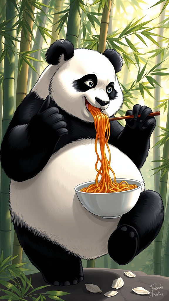 A rotund panda poised gracefully on one leg, indulging in a bowl of glistening noodles, depicted in the intricate and dynamic style of Takeshi Obata, embodying the essence of Shueisha anime, captured in stunning 8k resolution. The scene is set amidst a serene bamboo grove, with dappled sunlight filtering through the leaves, casting playful shadows on the panda's fur. Its eyes, lively and expressive, reflect the joy of savoring each noodle strand, while a gentle breeze ruffles its fur, adding motion to the tranquil moment.
