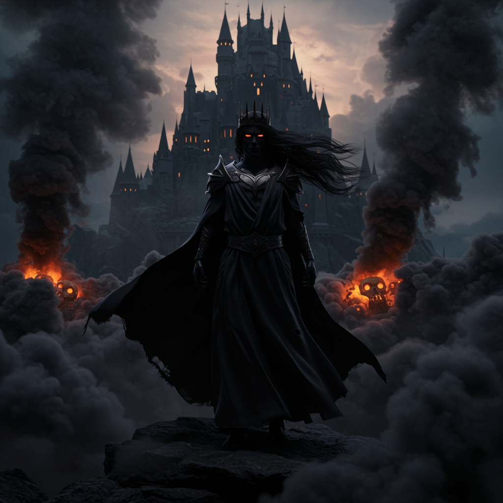 A royal figure shrouded in darkness with long, windblown hair and flowing cloth, reminiscent of a Magic the Gathering card. The scene is set against a background of a huge, dark castle enveloped in clouds of toxic fumes and spiral smoke, creating an ominous atmosphere. The figure strikes a gorgeous pose, their form defined by dramatic shadows and vibrant contrast. Orthodox symbolism and tribal dark fantasy elements blend seamlessly, creating an emotional and ambient setting. The scene is rendered in ultra-detailed 3D quality, enhanced by cinematic lighting and VFX in an isometric view. Created in Blender with the precision of an 8k resolution, the image captures a hyper-realistic visual with the immersive quality of Unreal Engine and Octane rendering, offering an artistic portrayal worthy of ArtStation.
