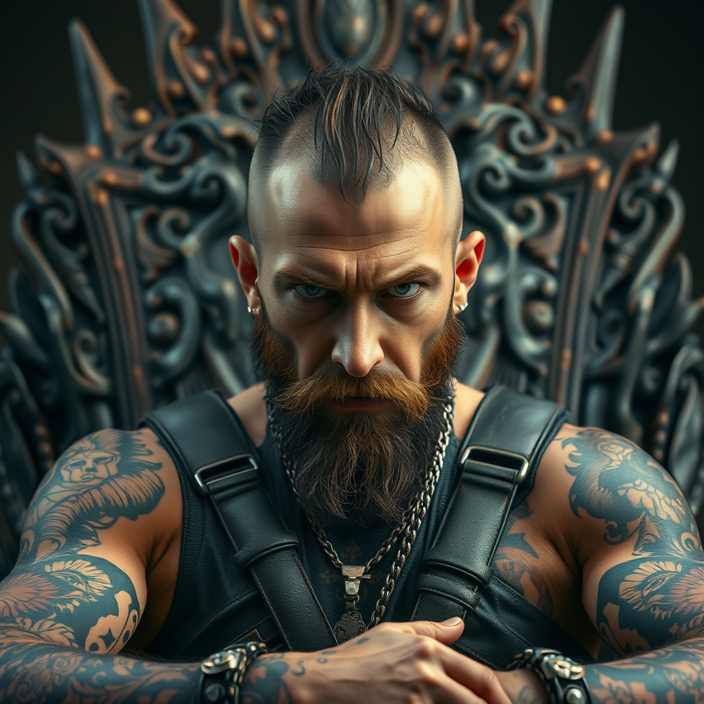 A rugged and intimidating punk-inspired man, exuding strength and anger, sits regally on a throne, adorned with intricate tattoos reminiscent of Game of Thrones. His piercing gaze meets the viewer’s eyes, captured in a hyper-realistic portrait. The photograph showcases his detailed, weathered skin with exceptional clarity, rendered in 8k resolution for breathtaking detail. The full-length frame composition highlights his commanding presence, while the RAW color art captures every nuance. Bathed in diffused soft lighting with sharp focus, the image employs cinematic lighting to enhance the hyperrealism of this striking character study.