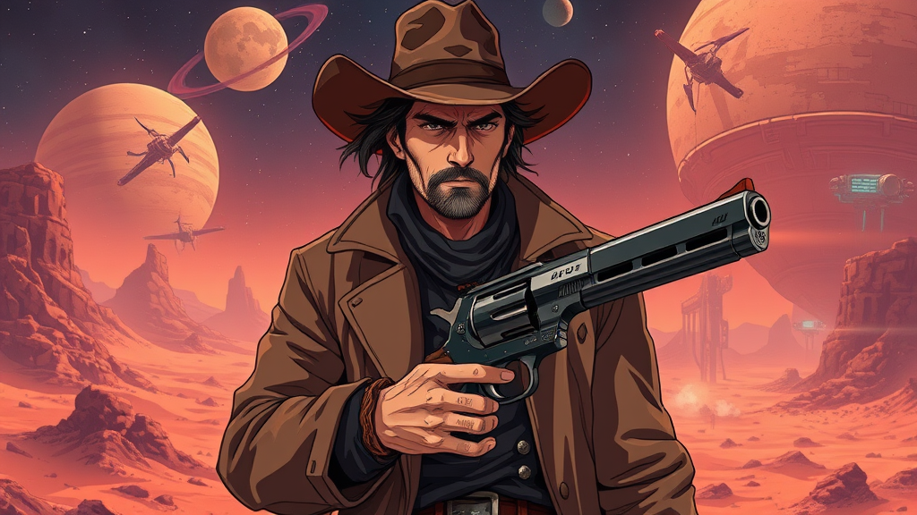 A rugged, anime space cowboy inspired by John Wayne, set in a futuristic world with a blend of Cowboy Bebop and Trigun vibes. This space western hero wears a weathered hat and long coat, armed with a high-tech revolver, navigating a universe filled with outlaws and bounty hunters. The landscape combines dusty desert planets and neon-lit space stations, capturing a unique fusion of western and sci-fi elements. The character retains a strong and stoic demeanor, epitomizing the essence of a timeless gunslinger in a galactic frontier.