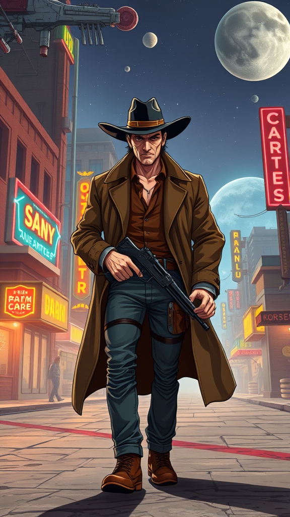A rugged anime space cowboy with John Wayne’s iconic features, set in a vibrant universe reminiscent of Cowboy Bebop and Trigun. Wearing a futuristic cowboy hat and a duster coat, he strides with a confident gait through a bustling spaceport. His laser revolver rests in a holster, ready for action. The backdrop features a blend of Western town elements with sleek sci-fi architecture, glowing neon signs, and distant planets in the sky. The atmosphere is a fusion of classic Western grit and high-tech sci-fi, capturing the essence of a space frontier.