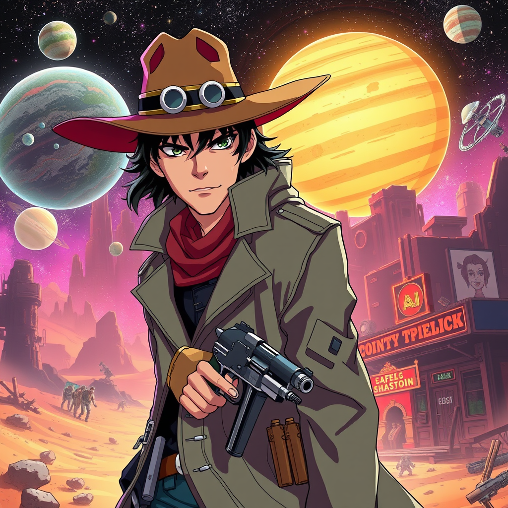 A rugged anime space cowboy with the charisma and grit of John Wayne roams a vibrant sci-fi universe, blending elements of Cowboy Bebop and Trigun. He dons a futuristic duster coat with high-tech gadgets, a wide-brimmed hat casting shadows over his steely eyes, and a laser revolver at his hip. His companion, a snarky AI hologram, assists him on his bounty hunting adventures through neon-lit space stations and lawless asteroid towns. The backdrop features a dazzling array of planets, from dusty desert worlds to bustling intergalactic saloons, embodying the classic western spirit in a modern, animated cosmos.