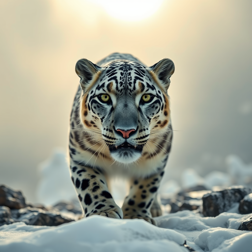 A rugged Arktos snow leopard emerges from the dense fog, its snow-white fur blending seamlessly with the mist-shrouded rocky terrain of the Himalayan mountains, as sunshine breaks through the cloudy sky to cast a warm glow on its majestic form, a frozen landscape stretching out behind it, photographed in a 2:3 aspect ratio and tremendous detail with a very high resolution, the snow leopard's piercing gaze locks onto the viewer's soul, rendered in crisp focus, every silky strand of its fur and muscular fibre visible, the snout twitching, whiskers vibrating, ears perked, and eyes blazing with a predatory intensity that speaks of ancient stealth hunters, this stunning creature turns its head, neck muscles corded, to define the visceral landscape with a liquescent stare, absorbing the enduring climates of a desolate beauty.