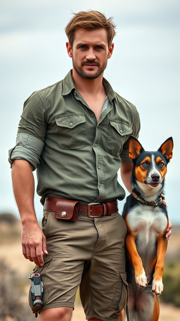 A rugged Australian man in his late 20s to early 30s stands confidently with his loyal canine companion, an Australian Kelpie, by his side. The man, exuding an adventurous spirit, boasts a sun-kissed, weathered complexion, a testament to his outdoor lifestyle. He has a strong, athletic build with a rugged face featuring a strong jawline, light stubble, and piercing blue eyes that convey both confidence and warmth. His short, messy hair is tousled by the wind, with natural brown highlights adding character. He wears an olive-green, short-sleeve shirt with rolled sleeves that reveal his muscular forearms, paired with weathered khaki cargo shorts marked by small rips and dirt from countless adventures. Sturdy, worn boots and a brown leather belt equipped with a multi-tool and flashlight speak to his readiness for any outdoor challenge. Standing tall and relaxed, his hand gently rests on his dog's back, symbolizing their deep bond, while the other hand hangs by his side, ready for action. The Australian Kelpie, sleek and agile with a glossy black and tan coat, stands loyally. Its upright ears and bright, alert eyes reflect intelligence and loyalty. Slightly leaning towards the man, its tail is raised in excitement, complementing the ruggedness of its human counterpart. The minimalistic pure white background subtly hints at the Australian outback with blurred silhouettes of red earth and sparse trees, emphasizing the focus on the pair. Natural, warm lighting illuminates them, highlighting earthy tones of deep greens, browns, and sandy yellows in their attire and the dog's fur, creating soft shadows that accentuate their features. This striking illustration conveys adventure, strength, and companionship, perfect for a men's phone case, appealing to those with a love for the outdoors and the Australian spirit.
