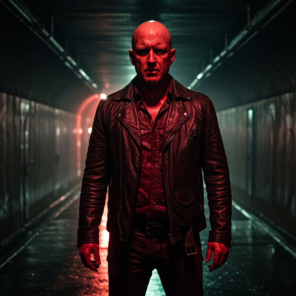 A rugged bald man, clad in a worn leather jacket, stands defiantly in a dimly lit tunnel, his face and body streaked with glistening traces of crimson. The floor beneath him shines with a slick, wet sheen, reflecting the intense red tones cast throughout the scene. Captured from a dramatic low angle, the composition exudes a cinematic tension, while dynamic lighting from behind casts a halo around his silhouette, enhancing the atmosphere of gritty realism and raw emotion.