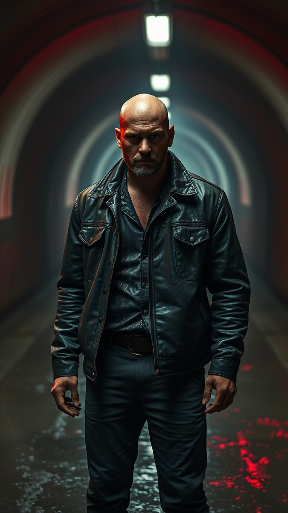 A rugged bald man in a weathered leather jacket, streaked with blood across his face and body, stands resolute in a dimly lit tunnel. The slick, wet floor gleams underfoot, casting reflections as a moody crimson hue envelops the scene. Captured from a low angle, the photograph radiates a cinematic flair, enhanced by dynamic backlighting that creates a dramatic and intense atmosphere.