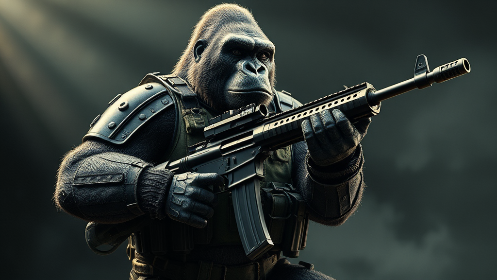 A rugged, battle-hardened gorilla, clad in intricate military armor, gripping a sleek carbine rifle. The creature stands in an upright, anthropomorphic stance, showcasing ultra-high-definition detail, with every aspect of its powerful physique and expressive face meticulously rendered. The setting features dramatic, cinematic lighting that casts dynamic shadows and highlights, adding a layer of realism to the scene. This visual captures the intense aura of a creature ready for combat, with an imposing presence that commands attention in an ultra-realistic, 8k resolution environment.
