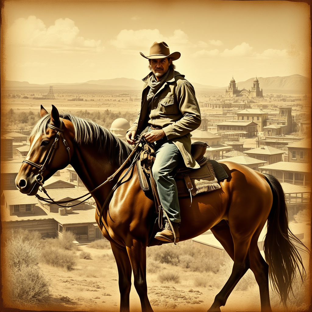 A rugged cowboy astride a sturdy horse, captured in a timeless sepia tone, with a western town sprawling in the background, as if painted by Leonardo Da Vinci, featuring a dynamic interplay of light and shadow, intricate details in the cowboy's weathered attire, and an emphasis on the horse's powerful muscles, evoking a sense of motion and strength, while the town's rustic architecture frames the scene with a classic yet artistic elegance.