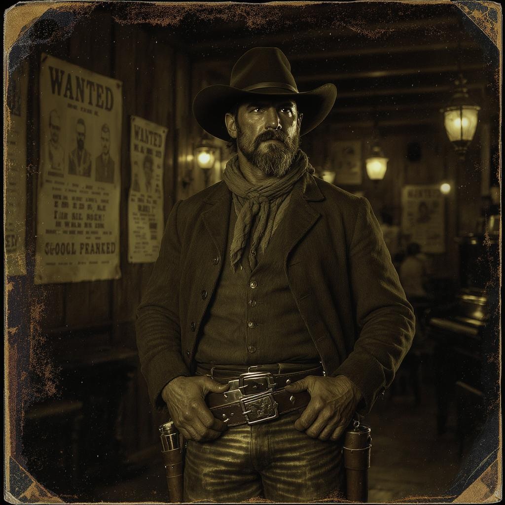 A rugged cowboy stands confidently in the dimly lit saloon, his weathered face shadowed beneath a broad-brimmed hat, eyes sharp and steady as he surveys the bustling room. The faint clinking of glasses and distant piano melodies fill the air, mingling with the scent of aged wood and tobacco. His hands, rough and steady, rest assuredly on his well-worn gun belt, fingers brushing the polished handle of his trusty revolver. The scene, captured in a faded tintype style, evokes the raw essence of the 1880s, with flickering lantern light casting long shadows across the wooden floors and walls adorned with sepia-toned wanted posters. The cowboy, a lone figure of quiet strength, embodies the untamed spirit of the Old West.