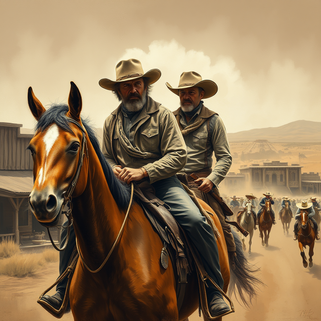 A rugged cowboy, weathered and determined, rides confidently on a powerful horse through a dusty western town, all captured in the masterful brushstrokes reminiscent of Leonardo Da Vinci's style, with the entire scene imbued in rich sepia tones, where the interplay of light and shadow reveals the intricate textures of leather, wood, and the cowboy’s stern yet thoughtful expression, hinting at personal tales etched in his eyes, set against the backdrop of a sprawling western landscape under an expansive sky.