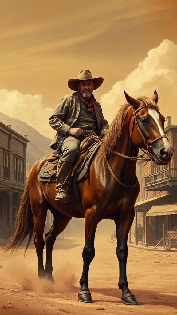 A rugged cowboy with a weathered face, riding a robust horse beneath the vast open sky, dressed in worn leather and dusty boots, exuding a timeless aura. The scene is set in a bustling, sepia-toned western town where wooden structures and dusty streets capture the essence of frontier life. In the style of Leonardo Da Vinci, the cowboy and horse are depicted with intricate attention to anatomical detail and realistic proportions, yet subtly infused with a touch of Renaissance elegance, blending the raw, untamed spirit of the West with the master’s iconic, graceful artistry.