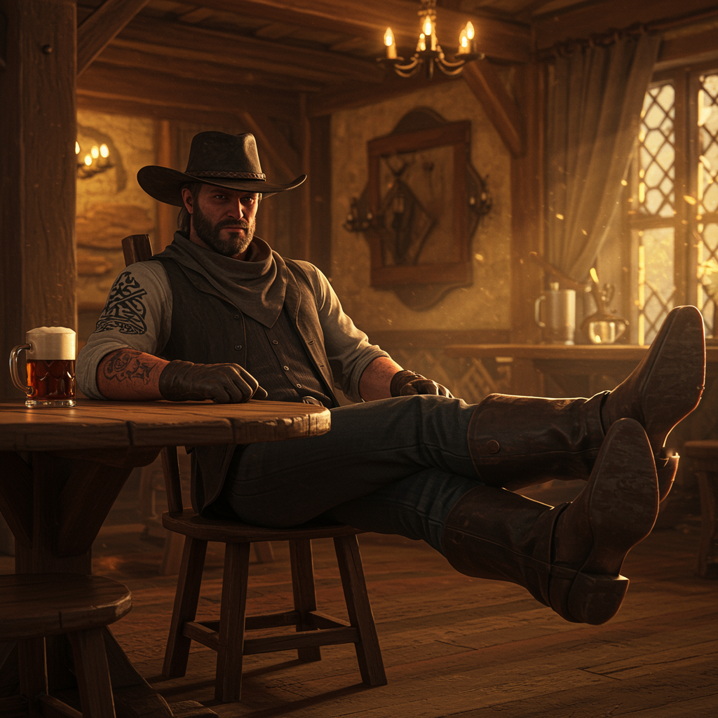 A rugged male cowboy, donning a wide-brimmed hat, sits confidently in a medieval tavern. His tattooed arm rests casually at his side, while his boot-clad feet are propped on the wooden table. The scene is illuminated by warm, cozy indoor lighting, capturing a cinematic and hyper-realistic feel, reminiscent of a detailed digital painting or an Unreal Engine render. The bright evening light streams in, adding a concept art touch to the atmosphere. This 8k photorealistic image boasts intricate textures and sharp detail, evoking an arcane style. The cowboy's presence is striking, embodying the essence of both Western and medieval worlds, without distractions or visual anomalies, ensuring an authentic, immersive experience.