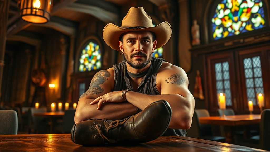 A rugged male cowboy, reminiscent of a classic western hero, sits confidently in a medieval tavern. His wide-brimmed hat casts a shadow over his eyes, adding an air of mystery. A distinctive tattoo wraps around his muscular arm. Boots rested on the wooden table, he embodies a relaxed yet commanding presence. The scene is illuminated with cozy indoor lighting, highlighting the detailed textures of the tavern's aged wood and flickering candles. The digital painting captures a hyperrealistic, cinematic quality with a focus on bright evening light streaming through stained glass windows. The setting is rendered in stunning 8k resolution, emphasizing photorealism and concept art finesse. The atmosphere blends elements of western and medieval styles, creating a unique and immersive visual experience. The cowboy's rugged demeanor and the tavern's architectural details invite viewers into a world where both genres coexist harmoniously.