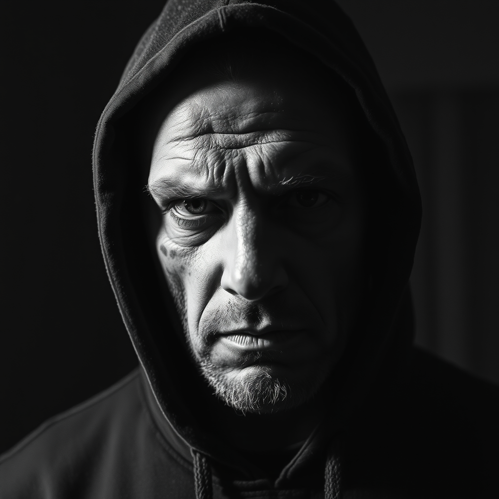 A rugged man, his face marked with scars, stands in a dimly lit room, wearing a hoodie that casts shadows across his stern expression. A close-up black and white portrait captures him with high contrast and a textured grain, reminiscent of an image taken with a Leica M6 film camera using an f/2 lens. The depth of field draws focus sharply to his piercing eyes, while subtle shadow play emphasizes his facial features. The hood softly blurs the edges of his face, enhancing the mysterious aura in a style reflective of classic portrait photography, with dimensions akin to an aspect ratio of 71:128.