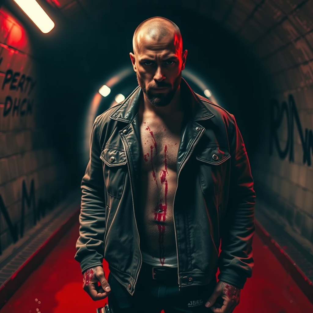 A rugged man with a shaved head and wearing a weathered leather jacket stands in a dimly lit tunnel, his face and body streaked with blood. The floor beneath him glistens with moisture, reflecting the tunnel's menacing aura. Captured from a low angle, the scene is bathed in a sinister red tone, enhancing the tension of this realistic, cinematic photograph. Dynamic lighting frames the man, casting dramatic shadows and highlighting the intensity of the moment.