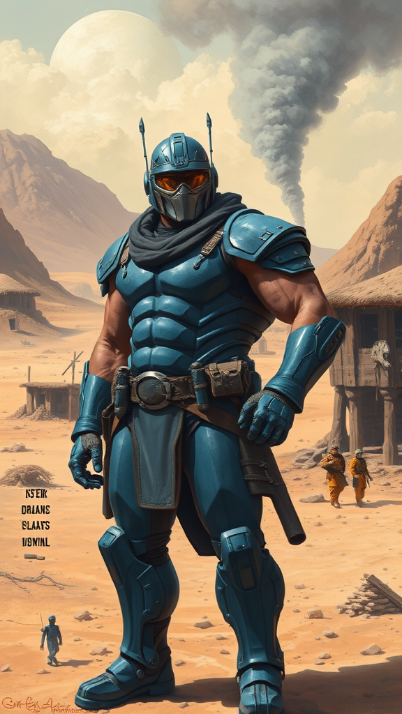 A rugged, muscular warrior clad in sleek, blue body armor stands resolute on the parched ground of an abandoned desert village, the landscape marred by the ominous plume of smoke curling into the sky. His futuristic goggles glint under the harsh sunlight, and the intricate detailing of his robot-like headpiece adds an avant-garde edge to his formidable presence. With a wave of his powerful hand, he surveys the desolation, embodying strength and determination. Capturing the magnetic allure of Boris Vallejo's fantasy realms, the dynamism of Frank Frazetta's heroic figures, and the polished realism of Alex Ross's art, this full-figure portrait exudes a raw, compelling intensity, bringing together classic and futuristic aesthetics in a striking harmony.