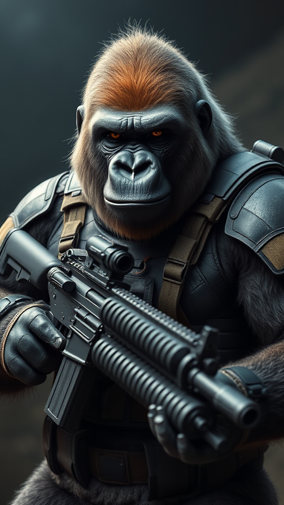 A rugged, seasoned gorilla clad in advanced military armor stands poised with a sleek carbine rifle, its anthropomorphic features reflecting a lifetime of combat experiences; every fur strand and muscle detail is meticulously captured in ultra-realistic 8K resolution. Its intense gaze and determined expression are brought to life with maximum facial detail, enveloped in cinematic lighting that accentuates the majesty and resilience of this formidable warrior. The atmosphere is intense and dynamic, embodying a sense of power and readiness.