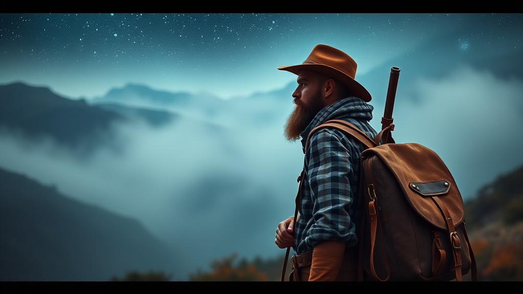 A rugged traveler named Johnny wanders through misty landscapes, guided by the stars, with a well-worn leather satchel filled with stories and maps, as he searches for hidden paths and the mysteries of distant horizons.