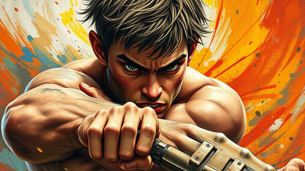 A rugged young man with short brown hair and piercing eyes, his muscular build showcasing a history of battles. Scars and marks etch stories of past fights across his face and body. In a moment of intense action, he is captured mid-battle, exuding strength and determination. His strong, weathered hands enhance his fierce presence. Styled in the manner of Prokoko, with bold, vivid brushstrokes painting energy and motion on the canvas. The background is a whirlwind of dynamic colors, adding depth to the scene's intensity.
