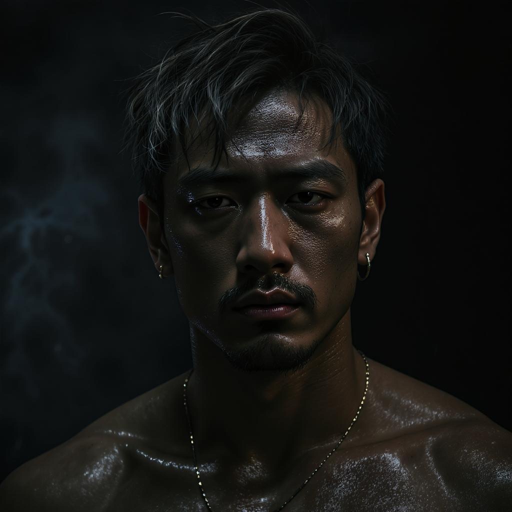 A ruggedly handsome 30-year-old Asian man with a dirty, stunningly detailed face, exuding a mysterious and peaceful expression. His hair is windswept against an oppressive and contrasting background; the scene is backlit from within, creating a dramatic and expressive backdrop with a gloomy sci-fi atmosphere. Captured in a cinematic shot from a low angle using a DSLR with an aperture of f/7, shutter speed of 1/100 sec, and ISO 150, the image is hyper-photorealistic with incredible detail and texture. The lighting is cinematic, enhancing the natural reflections. Elements of jewellery subtly glint, while the atmosphere evokes a sense of intrigue and narrative depth. The setting avoids any deformities or distortions, ensuring a focus on natural beauty and expression.