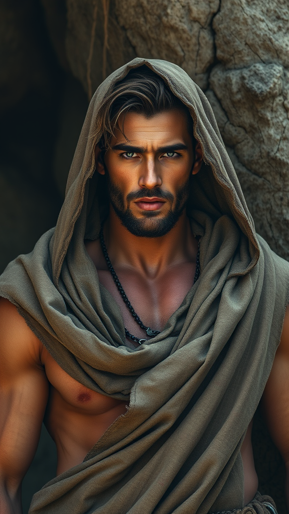 A ruggedly muscular and handsome man enshrouded in tattered aged cloth stands amid a richly detailed and lifelike background, his features exquisitely detailed and illuminated by crisp, natural lighting. The scene captures photorealism in stunning 8k resolution, with an artistic style inspired by the works of Artgerm, Greg Rutkowski, Alphonse Mucha, Loish, and WLOP, creating an image that resonates with the trending aesthetics on platforms like Tumblr. The natural colors and intricate textures evoke a sense of timelessness and narrative depth.
