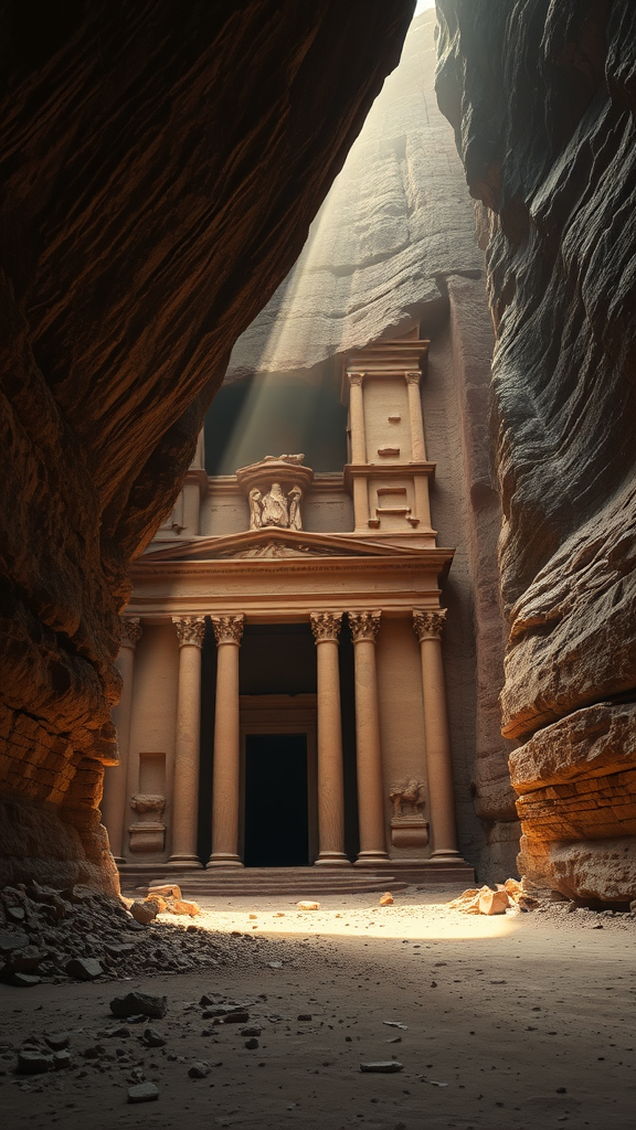A ruined Sumerian temple nestled within a canyon wall, partially hidden by shadows and surrounded by scattered debris at its entrance. The scene is set in a vast desert landscape, with dramatic light rays piercing through the dark canyon above, illuminating the temple in an ethereal glow. The architecture is reminiscent of the ancient city of Petra, with intricate carvings and weathered stone. The atmosphere is cinematic, enhanced by volumetric lighting that accentuates the temple's mystique. Despite the desert's arid environment, the scene is captured in stunning 16k UHD HDR resolution, showcasing every meticulous detail with extraordinary clarity. The focus remains on the temple's imposing facade, with no distractions or flaws such as distorted features, anomalies, or unwanted elements. The scene evokes a sense of awe and wonder, inviting viewers to imagine the stories and secrets hidden within the ancient structure.
