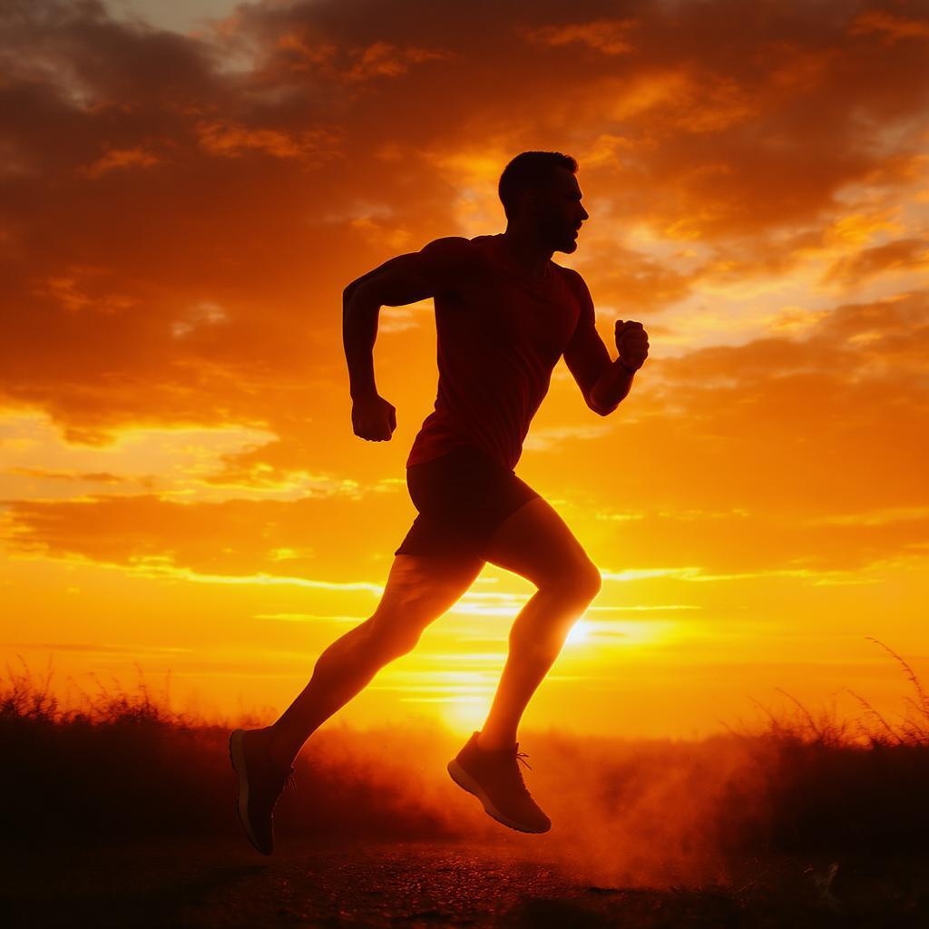 A runner silhouetted against a glowing sunrise, bathed in dramatic high-contrast lighting with vivid orange and bright yellow highlights. Textured shadows add depth to the scene, while cinematic motion blur captures the dynamic energy of the moment. The composition embodies a professional athletic branding style, with the runner perfectly centered against the dawn sky.