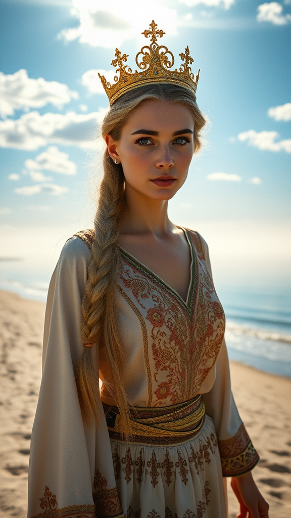 A Russian princess adorned in a golden crown and a traditional cultural dress, gracefully strolling along a serene beach under a vibrant blue sky dotted with clouds. Her long, braided blonde hair flows elegantly behind her, complementing her captivating gaze and alluring expression. She stands amidst a symmetrical background reminiscent of a cinematic film still from the 1980s, captured with the timeless quality of Kodak Portra 800. Her mesmerizing eyes and radiant skin are rendered with extreme detail, as are the intricate patterns of her elaborate attire. The scene is enveloped in a magical ambiance with radiant light rays piercing through a gentle fog, casting a dreamlike quality over the setting. The beach's soft sand meets the tranquil body of water, and the air carries a hint of mystical dust illuminated by light beams, adding to the heavenly aesthetic. This ultra-realistic depiction, with detailed facial features and a natural skin texture, brings the princess to life with high-focus realism, resembling the cover of an artful magazine shoot. The composition features subtle post-processing effects like ambient occlusion and tone mapping, enhancing its lifelike appearance with photorealistic shadows and a harmonious play of light and shade.