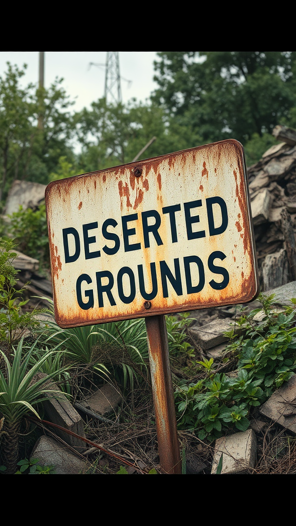 A rusted, battered sign stands crookedly amid overgrown rubble, the words "Deserted Grounds" barely visible beneath layers of grime and peeling paint, hinting at ages of neglect and eerie silence.