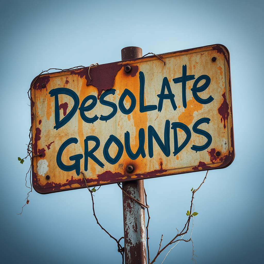 A rusted, bullet-riddled sign stands half-tilted, barely supported by its corroded metal post. The once-vibrant paint is now faded and peeling, revealing layers of neglect. "Desolate Grounds" is scrawled across it in jagged, weather-beaten letters, barely legible amidst the grime and vine tendrils that claw at its edges. The eerie silence around the sign amplifies its forlorn warning, whispering tales of a forgotten world.