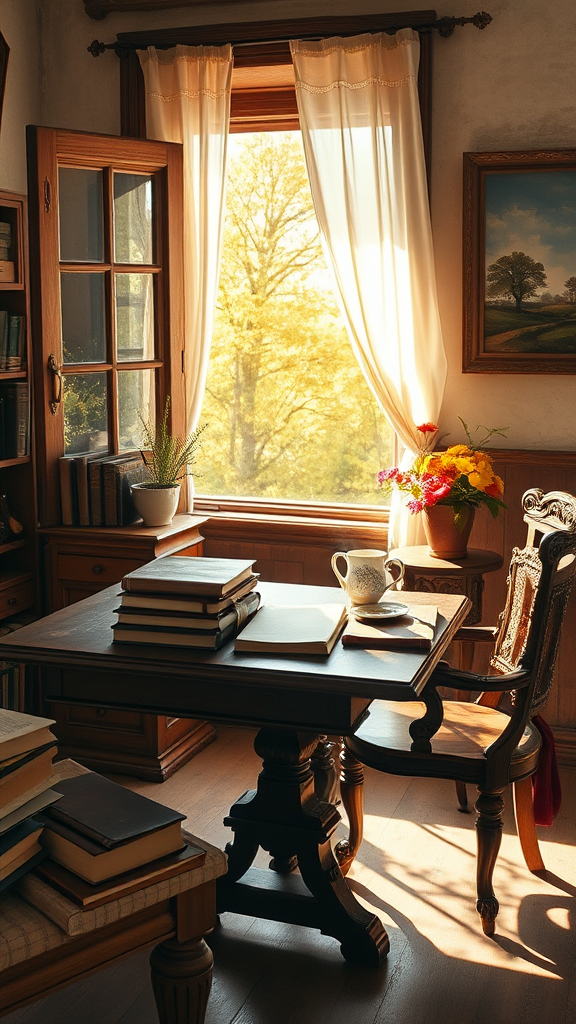 A rustic 1800s study room featuring a sturdy wooden table and an ornate chair, surrounded by an array of well-thumbed textbooks and a leather-bound notebook. A quill pen rests beside them. The window stands ajar, offering a glimpse of a dense, serene forest, while the delicate tulle curtains sway gently in the breeze. A delicate porcelain cup, brimming with steaming herbal tea, sends wisps of steam into the air. Vibrant potted flowers add life to the room, their petals catching the golden hues of the sun. The room, infused with the aroma of aged wood and leather, is bathed in the warm, golden-hour light streaming through the window. Sun rays dance across the floor, casting intricate patterns, while a watercolor painting on the wall captures a pastoral landscape, adding a layer of timeless elegance.