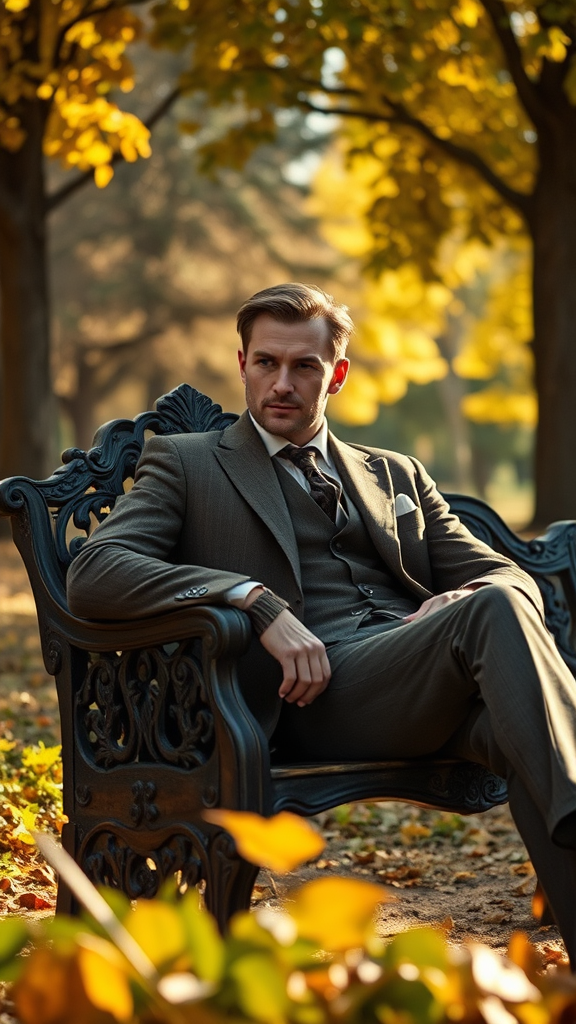 A rustic aristocrat styled as a modern-day vigilante, photographed by Sofia Coppola, gazing intently at the viewer while lounging on an intricately carved wooden bench in a sun-dappled park, enveloped in a cinematic glow, with every detail meticulously captured, from the texture of his tailored suit to the dappled light playing across the autumn leaves.