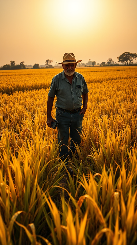 A rustic Spanish farmer stands amidst golden rice fields, their silhouette blending seamlessly with the delicate, intricate patterns of ripe rice grains under a sun-drenched sky, capturing the essence of rural life and agricultural abundance.