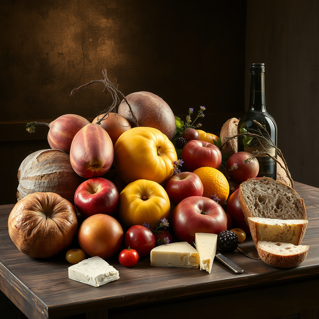 A rustic still life featuring an arrangement of abundant, oversized fruits beside a loaf of crusty artisanal bread, an aged wine bottle turned on its side, and a selection of fine cheeses, all set upon a weathered wooden table. The composition is gently illuminated by a diffused, warm light reminiscent of a Rembrandt painting, casting soft, dramatic shadows and highlighting the rich textures and earthy tones of the scene. A few wildflowers are scattered subtly among the arrangement, adding a touch of delicate color and life.