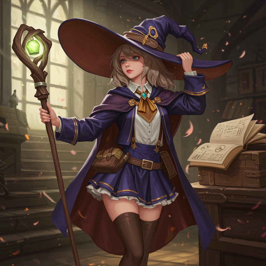 A rustic yet enchanting young sorceress dressed in a mystical academy uniform, adorned with a grand, wide-brimmed witch hat; the scene captures an elaborate, elegant essence with a cinematic flair, crafted as a digital masterpiece. The concept art radiates a sense of timeless charm, trending across art communities with its exquisite detail and captivating depth.